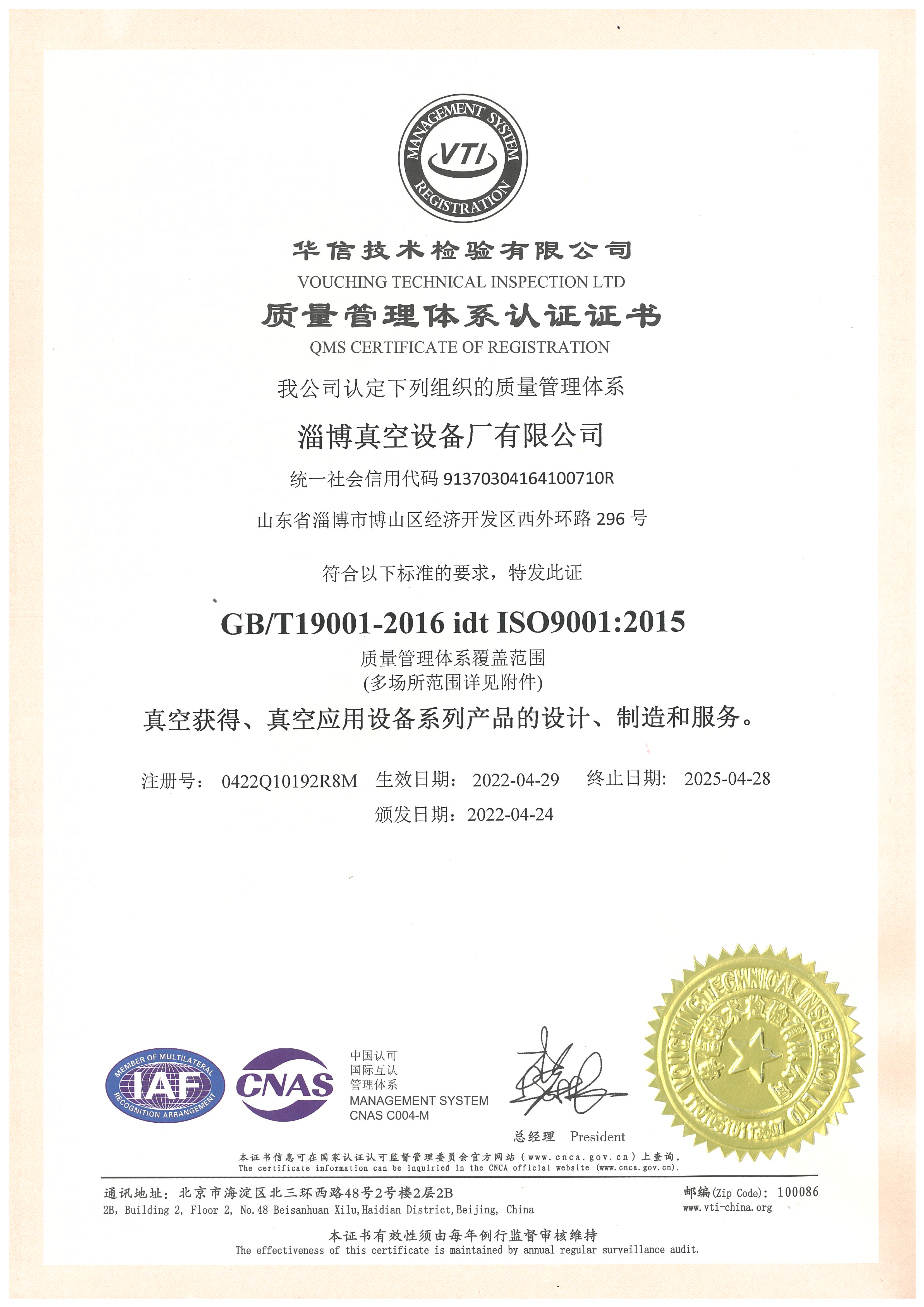 質(zhì)量管理體系認(rèn)證證書