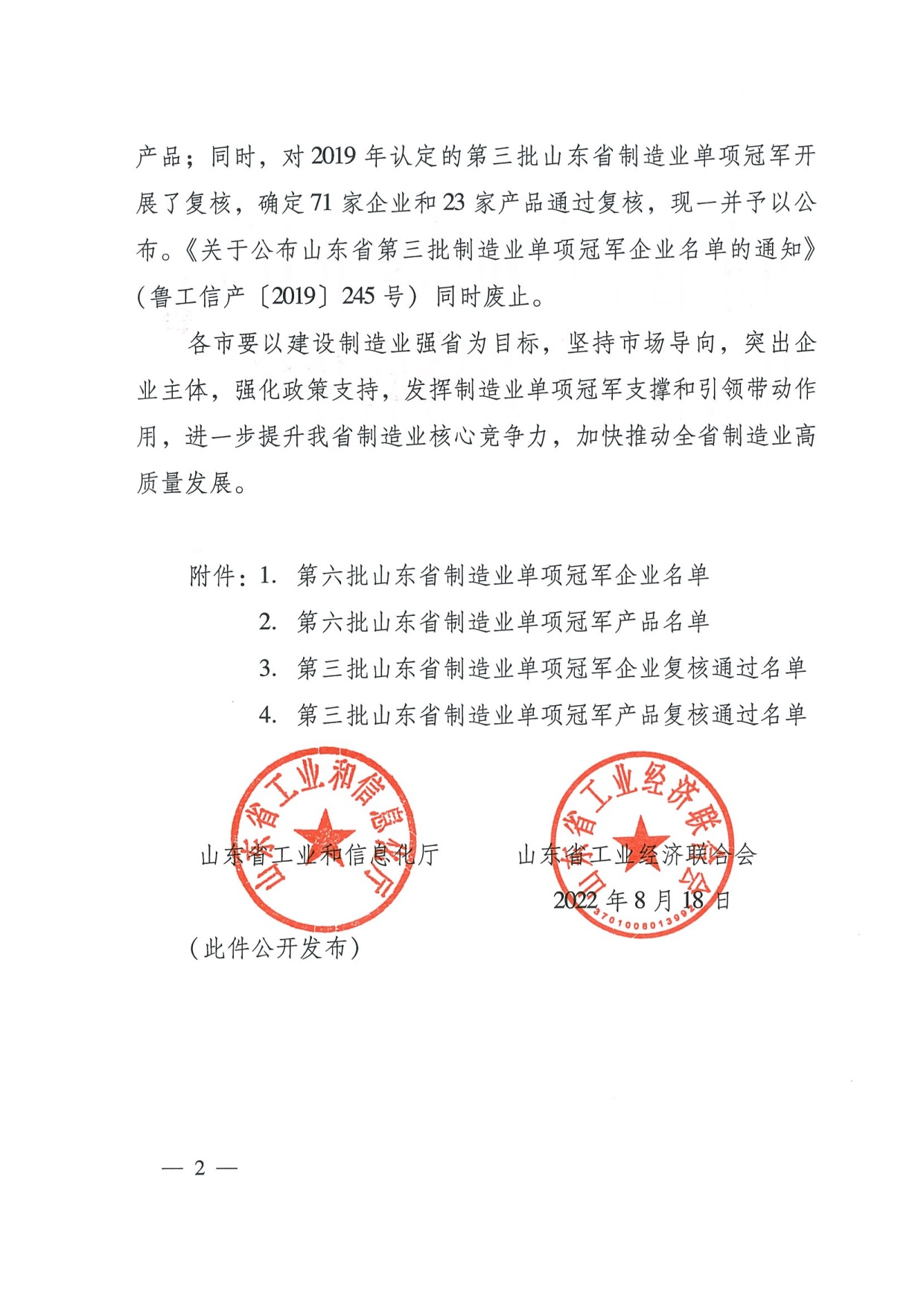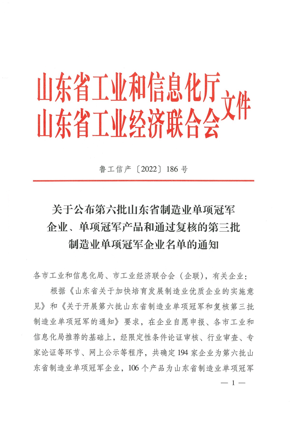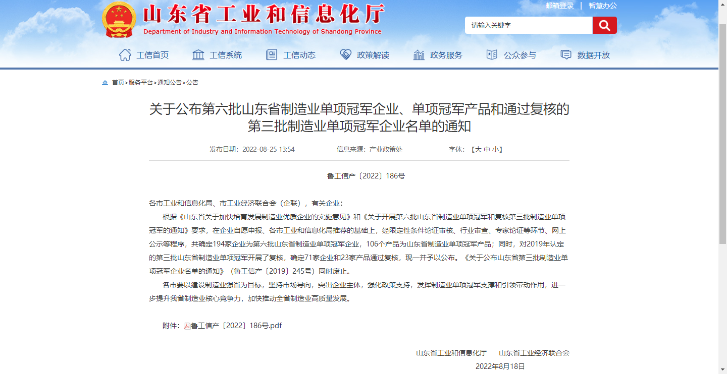 公司榮獲山東省制造業(yè)單項(xiàng)冠軍企業(yè)