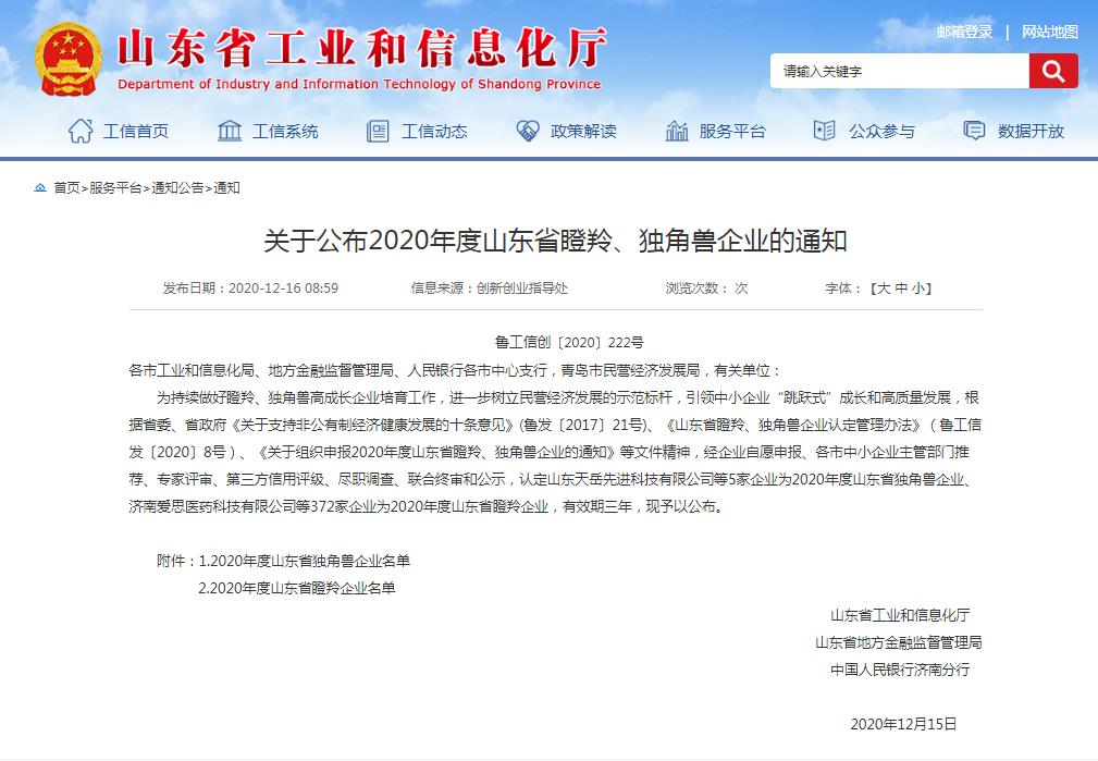 12月15日,根據(jù)《關(guān)于公布2020年度山東省瞪羚、獨(dú)角獸企業(yè)的通知》魯工信創(chuàng)[2020]222號文,省工業(yè)和信息化廳確定5家企業(yè)為2020年度山東省獨(dú)角獸企業(yè)、372家企業(yè)為2020年度山東省瞪羚企業(yè)。雙山真空作為山東省真空設(shè)備龍頭企業(yè),以領(lǐng)先的科技研發(fā)和穩(wěn)定增長的市場占有率入選為2020年度山東省瞪羚企業(yè)!