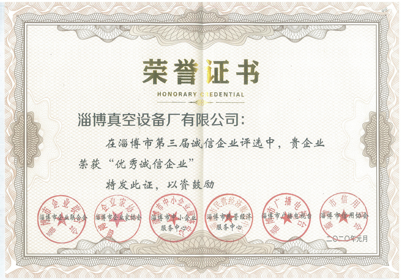 2020年1月9日,淄博市第三屆誠信企業(yè)授牌儀式在山東齊盛國際賓館會(huì)議中心隆重舉行。在本次評選授獎(jiǎng)活動(dòng)中,淄博真空設(shè)備廠有限公司再次被評為“淄博市優(yōu)秀誠信企業(yè)”。